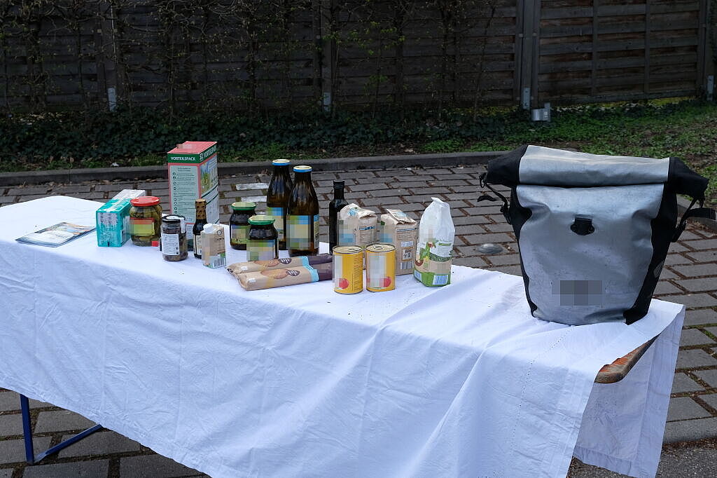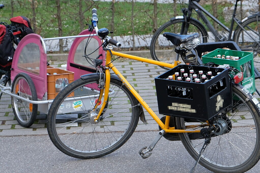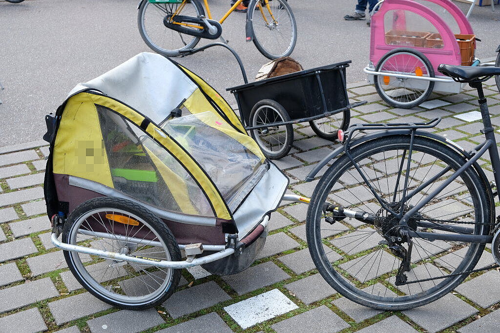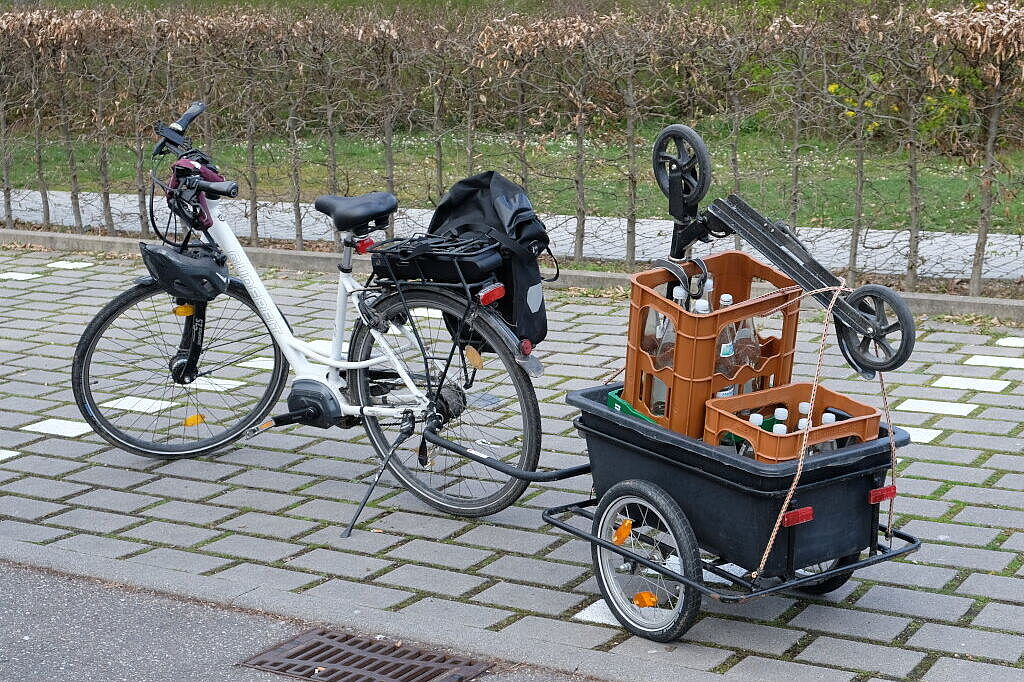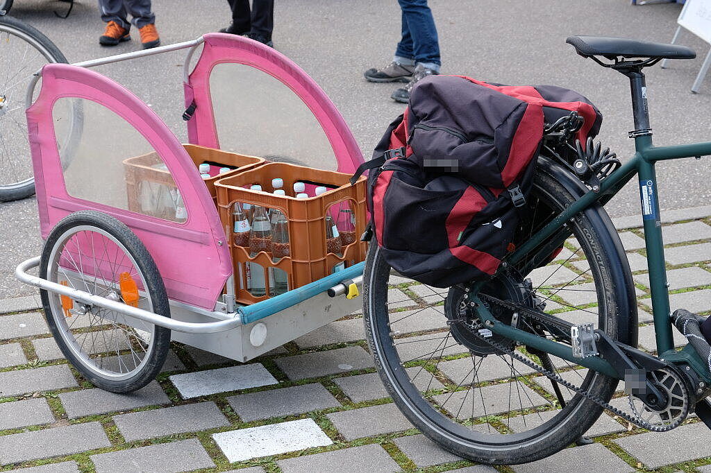 Am Messe-Sonntag war auf dem ADFC-Stand ganz schön was los. Viele Messebesucher*innen begeisterten sich für unsere vielseitige Sonderschau von Transportmöglichkeiten mit dem Fahrrad. Auf dem Schlossparkplatz hatten wir verschiedene Anhänger, ein Lastenrad und andere Transportlösungen ausgestellt. Die Alltagstauglichkeit war gewährleistet, denn alle Ausstellungsstücke wurden von Aktiven und Freunden des ADFC Strohgäu so bereitgestellt, wie sie auch im Alltag regelmäßig Verwendung finden. Darunter ein Anhänger mit Getränkekisten, und einer mit Brennholz. Ebenso auch ein umgenutzter Kinderanhänger für Einkäufe. Besondere Aufmerksamkeit erhielt das unscheinbarste Produkt, eine Hakenplatte für den Gepäckträger, in die zwei Getränkekisten seitlich eingehängt werden können. Auf einem Tisch war eine handelsübliche Packtasche ausgestellt, und daneben alle Lebensmittel und Haushaltsprodukte, die in die Tasche hineinpassen. Das ergab eine ansehnliche Menge!